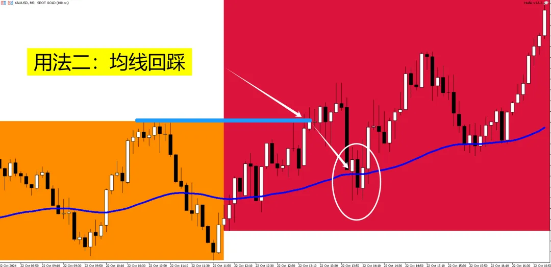 【用法二】均线回踩。先突破再回踩均线,顺势开多。反之开空。