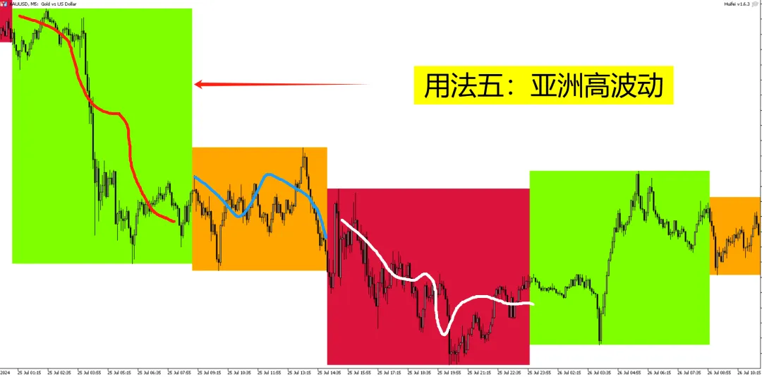 【用法五】亚洲高波动。此种异常情况出现,大概率欧美时间段会延续亚洲盘的方向,比如下图亚洲盘下跌,欧美盘也下跌。