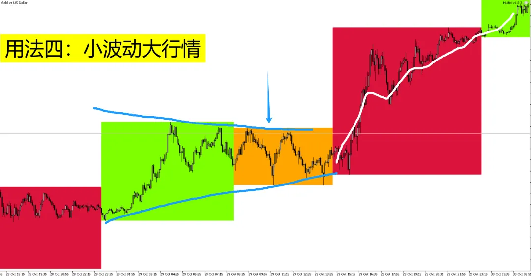 【用法四】小波动大行情。欧盘或美盘或亚盘波动变小。即将诞生的突破行情会更大,顺势交易即可。