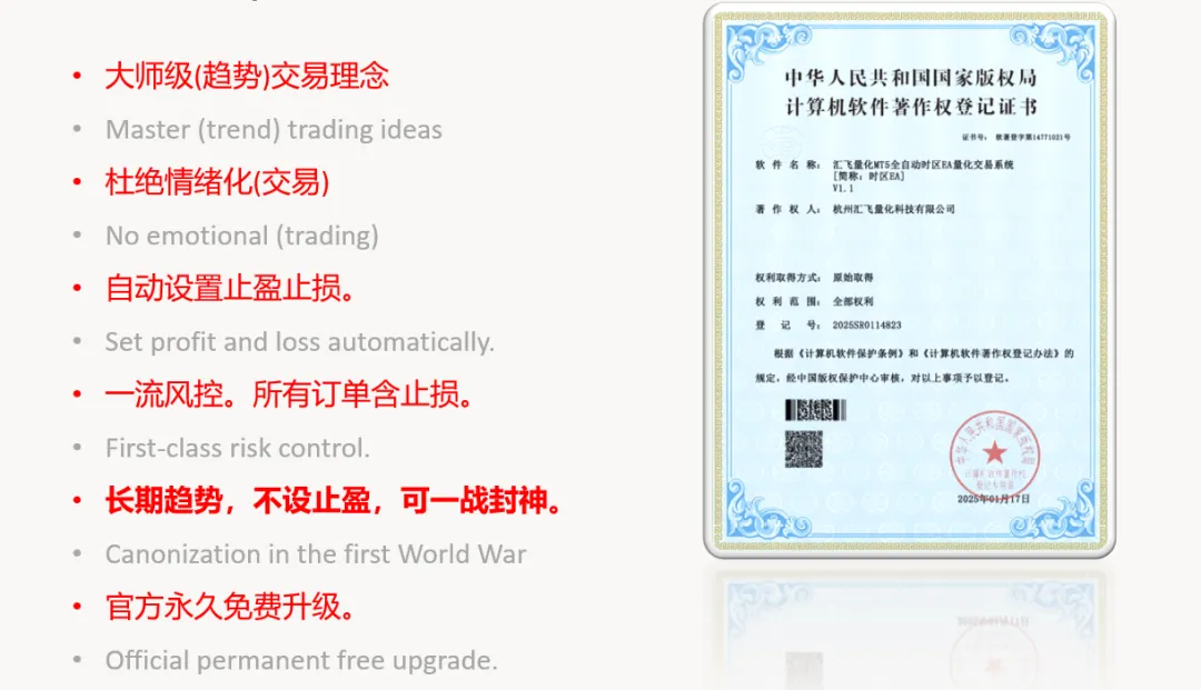 汇飞量化【时区】已经荣获中国国家版权局知识产权保护(证书编号2025SR0114823)。