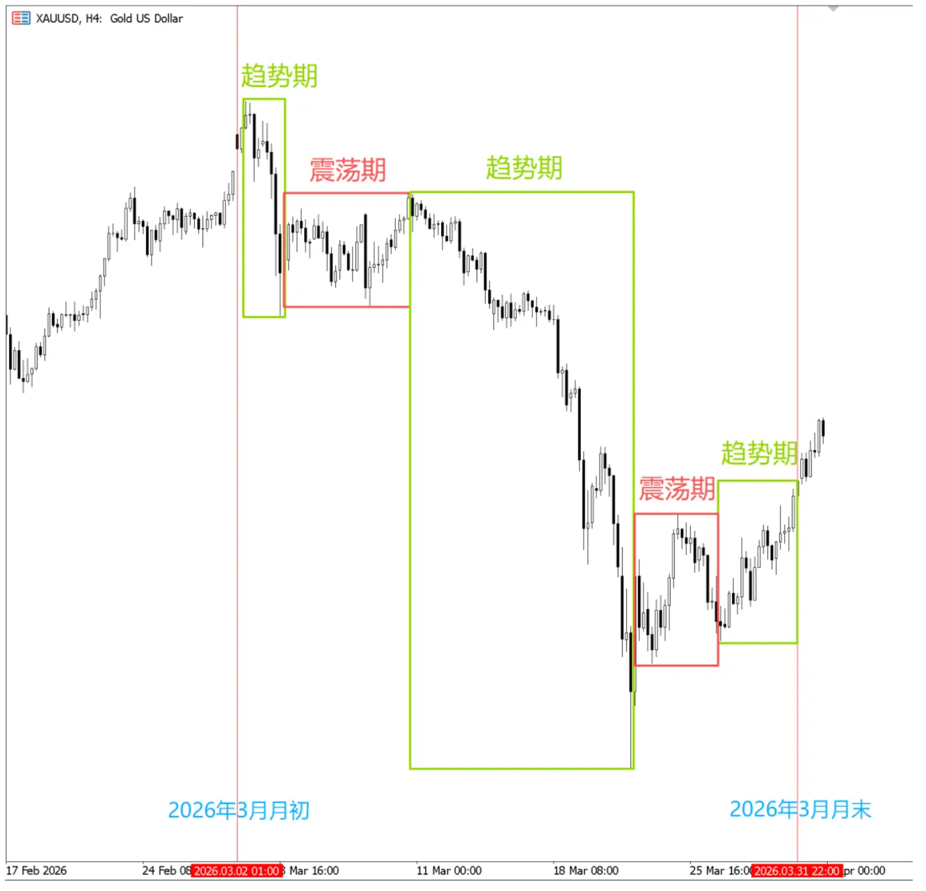 本部分内容主要分析黄金品种。下图是2026年3月份黄金(XAUUSD)的4小时K线图,绿色/红色方框代表的是4小时级别的波段,这同时也是在小周期时间框架如15分钟所呈现出来的趋势或震荡动态。