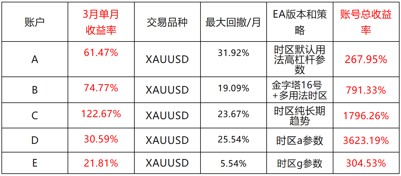 汇飞量化时区/金字塔EA中3月份表现最亮眼的是C账号,3月收益率达到122.67%。C账号所使用的参数策略是时区纯长期趋势,这反映了不设止盈、通过移动止损来捕捉大行情的策略在行情中的有效性。也反映当前的时区系统和金字塔AI的设计和运营基本符合预期。
