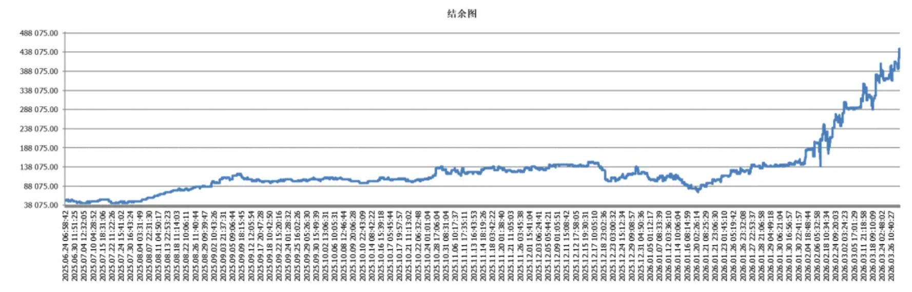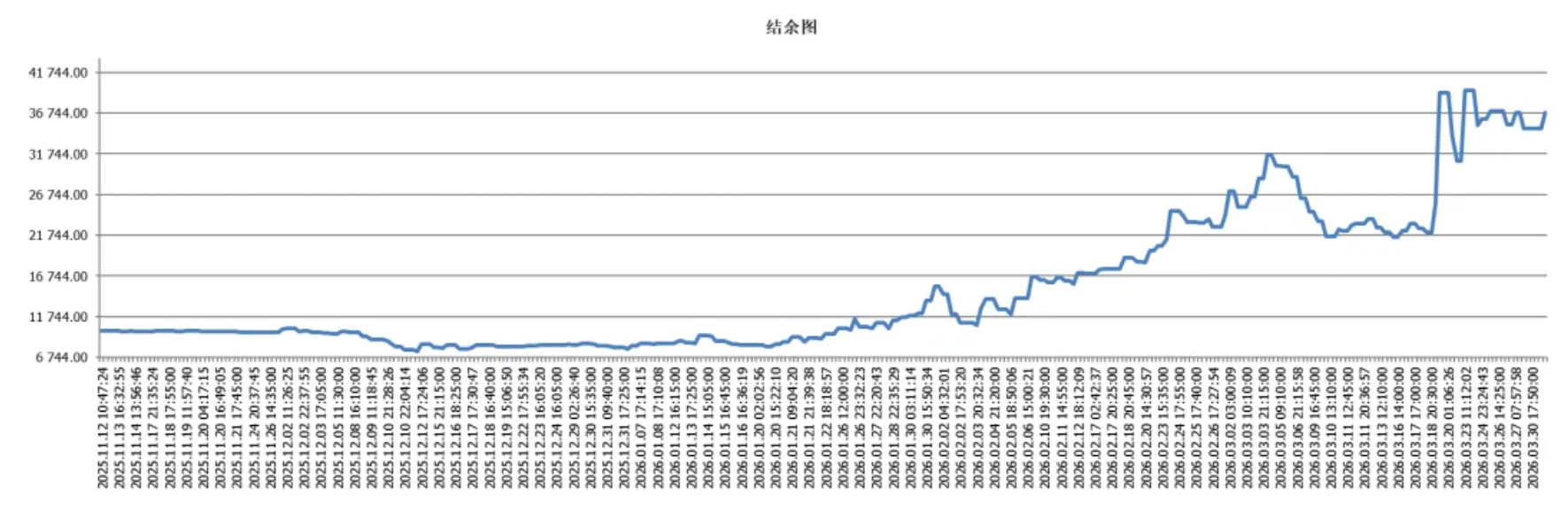 该账户使用的参数是时区默认用法,仅将杠杆从默认参数0.5调整至5以及提高了保证金使用占比。该账户在2025.11.12-2026.1.21之间并未取得较大收益,但在2026.1.21之后,账户的结余资金曲线开始增长。每个月的平均月收益率达到了59.54%,最大回撤整体控制在35%以内。