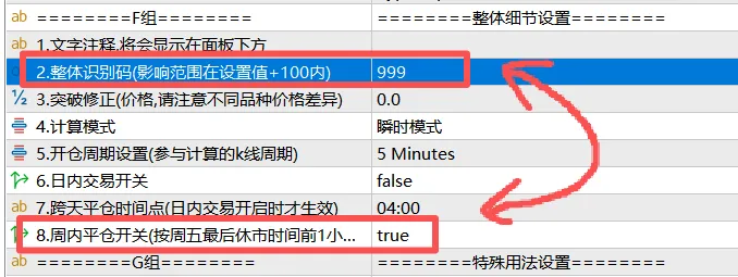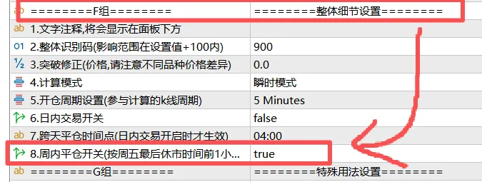 然后,同时再开启“周内平仓开关”选择true即可。这样周末休市前1小时,时区EA就能为本识别码的EA进行定时平仓了。