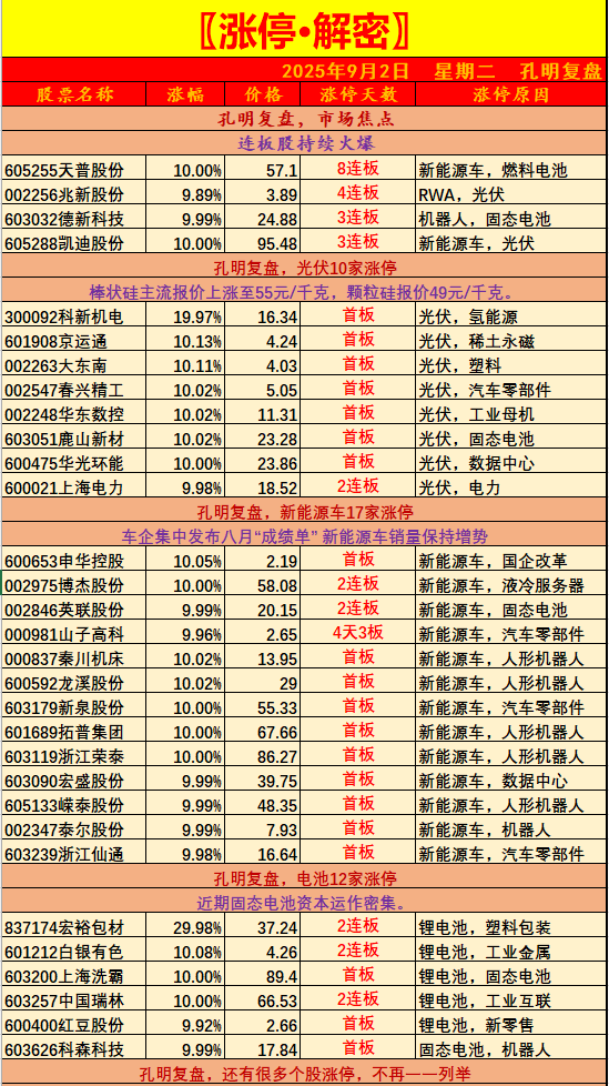 近期强势股【天普股份、兆新股份、德新科技、凯迪股份】持续连板,连板股留意:华东数控、鹿山新材、安正时尚