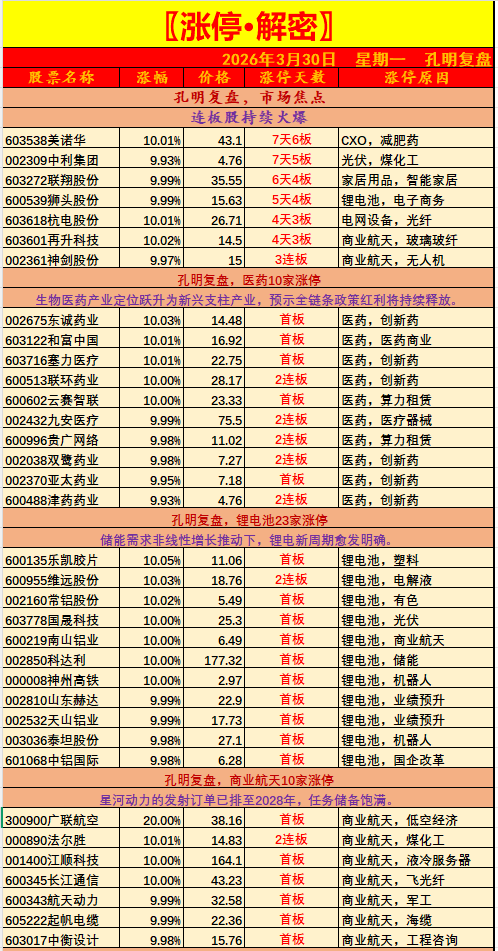 【2连板】 法尔胜、双鹭药业、九安医疗、中农联合、津药药业、联环药业、狮头股份、维远股份、贵广网络、苏利股份、杭电股份。