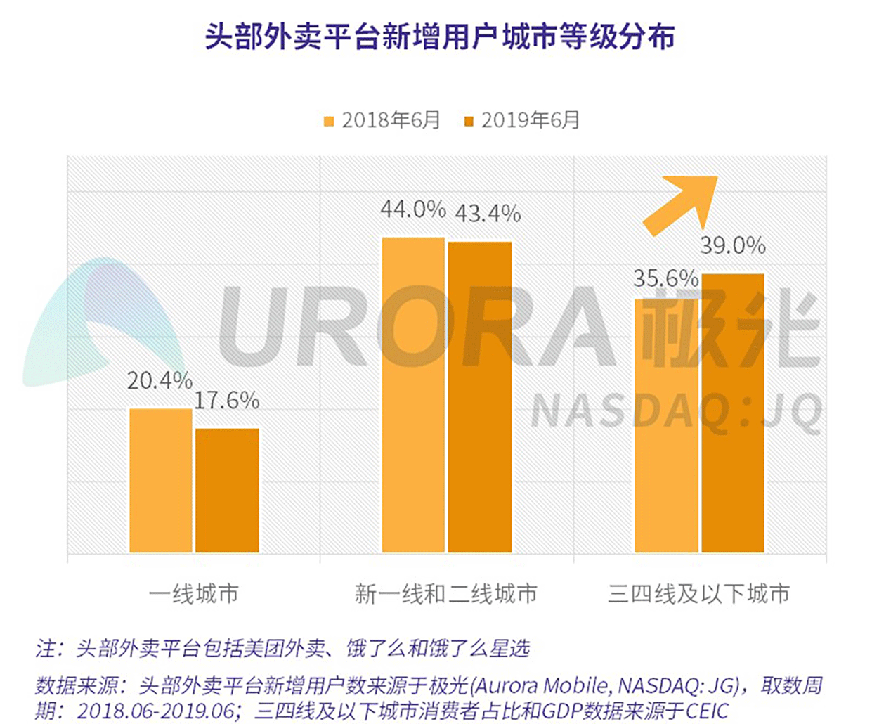 外卖平台用户不断增加,下沉市场潜力巨大。外卖平台用户不断增加,进入2019年,三四线及以下城市增速明显。极光的统计结果显示,头部外卖平台优势日益凸显,其新增用户数在三四线及以下城市的占比持续扩大,表明三四线及以下城市增速相对较快,头部企业也加大三四线及以下城市的扩张根据公开数据显示,三四线及以下城市的消费者占比达七成以上,GDP占全国近六成,表明下沉市场潜力巨大。本报告重点研究三四线及以下城市,把三四线及以下城市作为研究对象,称为下沉市场,对下沉市场的外卖行业进行综合分析。