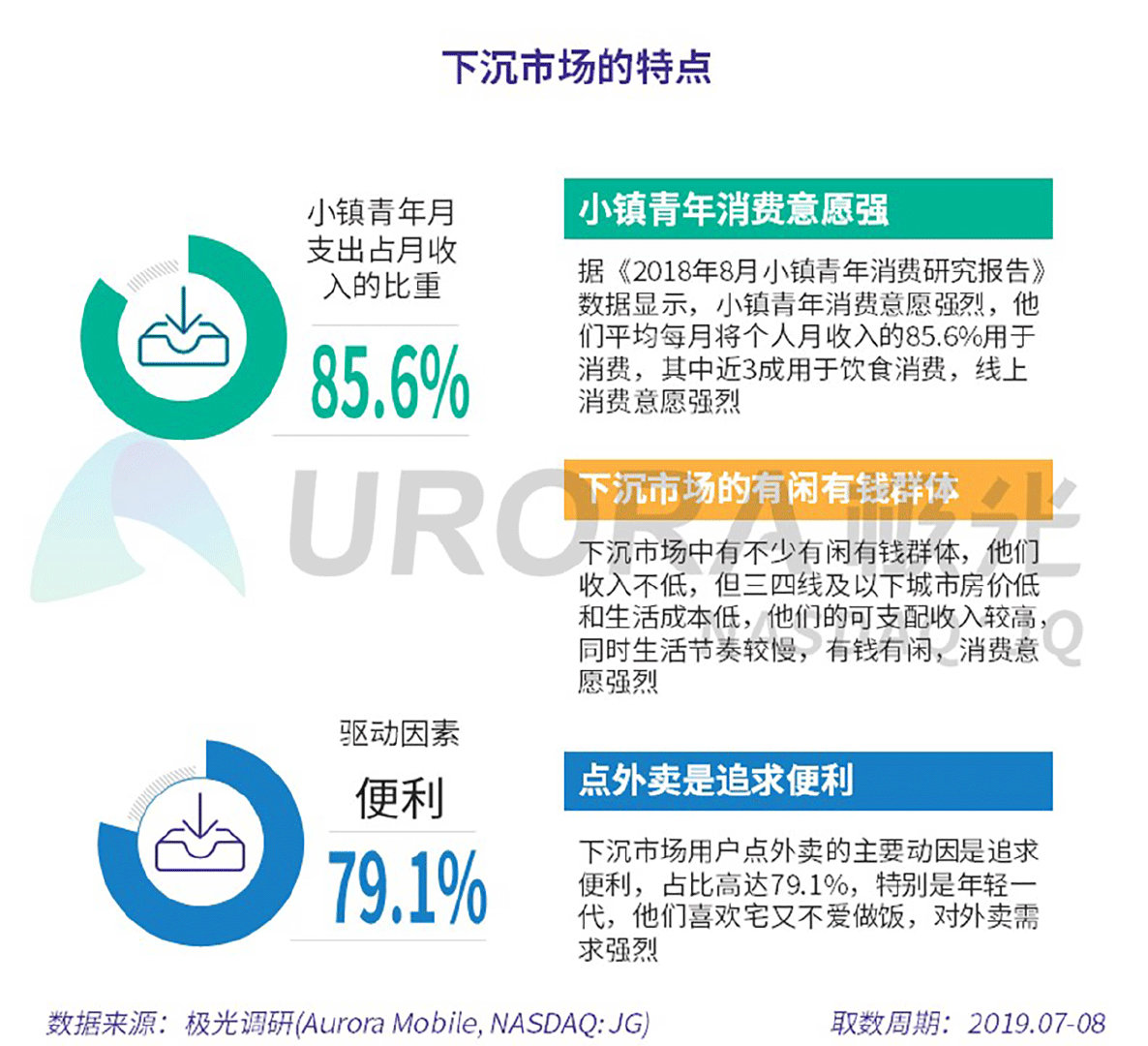极光的统计结果显示,下沉市场用户消费力强,对外卖消费有诉求。下沉市场的小镇青年和有闲有钱群体,消费意愿强烈;其中,小镇青年月收入的八成以上用于消费,消费潜力巨大。同时,便利成为下沉市场用户点外卖的主因,占比近八成。
