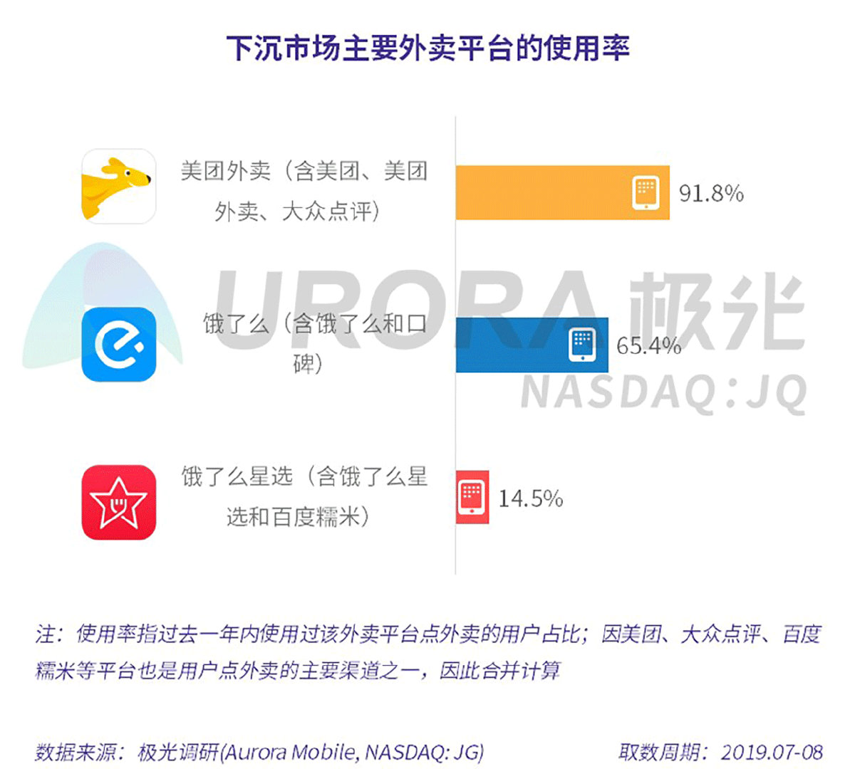 1)极光 (Aurora Mobile, NASDAQ:JG),源于极光云服务平台的行业数据采集及极光iAPP平台针对各类移动应用的长期监测,并结合大样本算法开展的数据挖掘和统计分析;2)极光调研数据,通过极光调研平台进行网络调研,共回收外卖用户样本1033份,商家用户样本500份;3)其他合法收集的数据。以上均系依据相关法律法规,经用户合法授权采集数据,同时经过对数据脱敏后形成大数据分析报告。