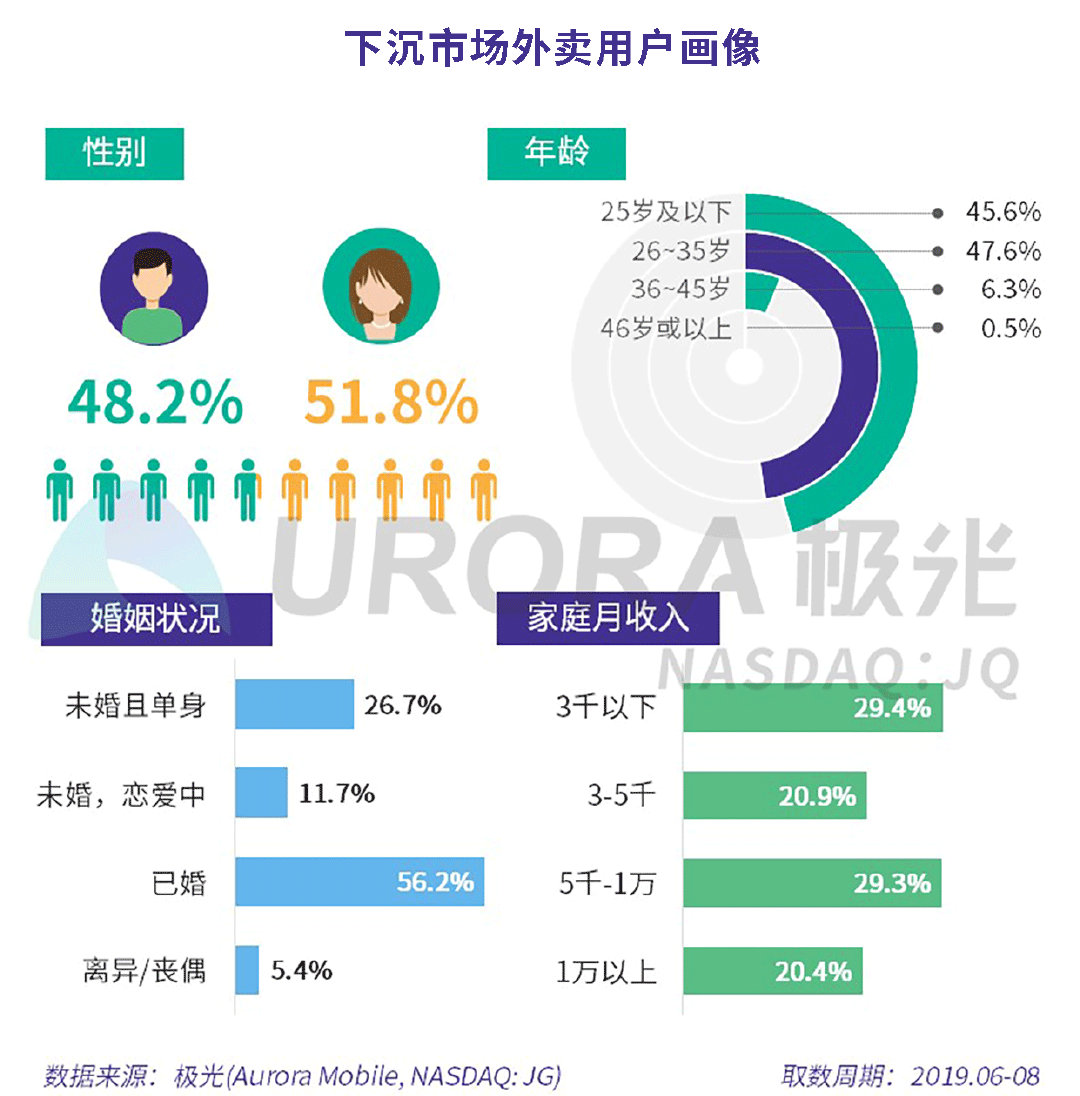 下沉市场外卖用户以35岁以下中青年为主,其中一半用户已婚,女性占比略高,达51.8%。