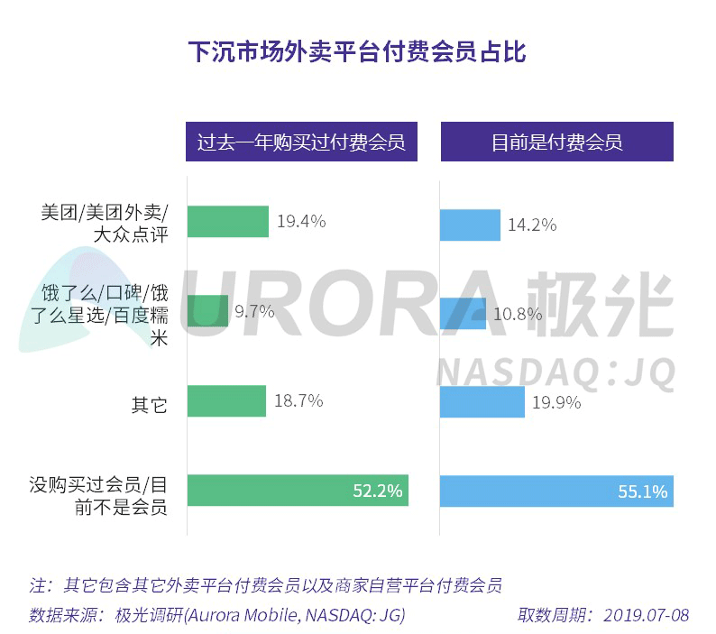 极光的统计结果显示,近两成用户在过去一年购买过美团外卖的付费会员,14.2%的用户目前是美团外卖的付费会员,均高于饿了么。同时,下沉市场中有超过五成用户过去一年内从未购买过付费会员,在这方面的挖掘潜力巨大。