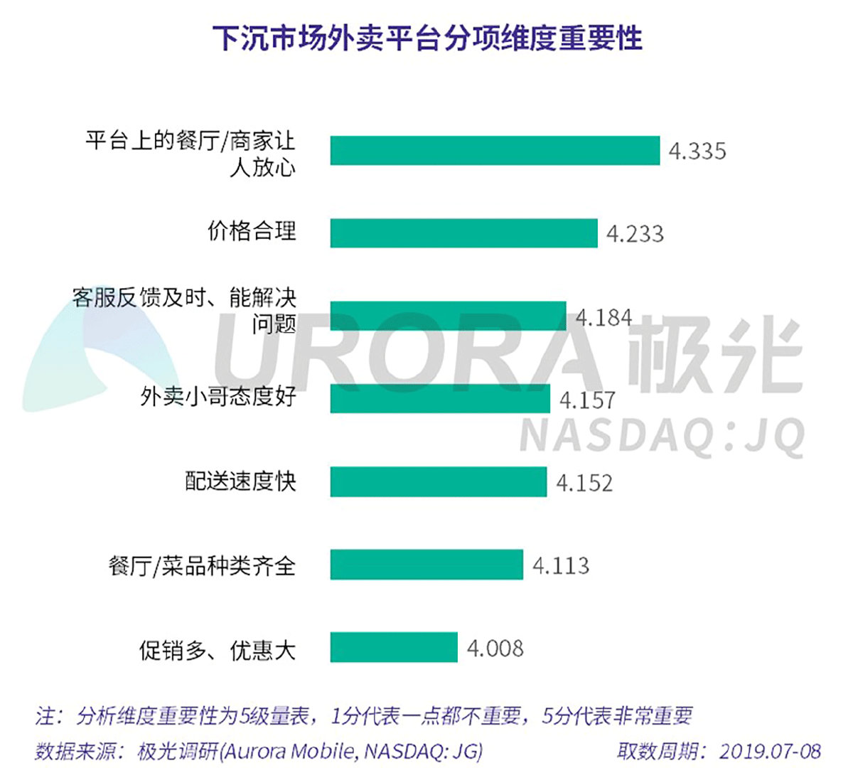 极光的统计结果显示,外卖用户最关心平台上的餐厅/商家是否让人放心,其重要性均值达4.335,明显高于其它维度;第二重要的维度是价格合理,重要性均值为4.233。