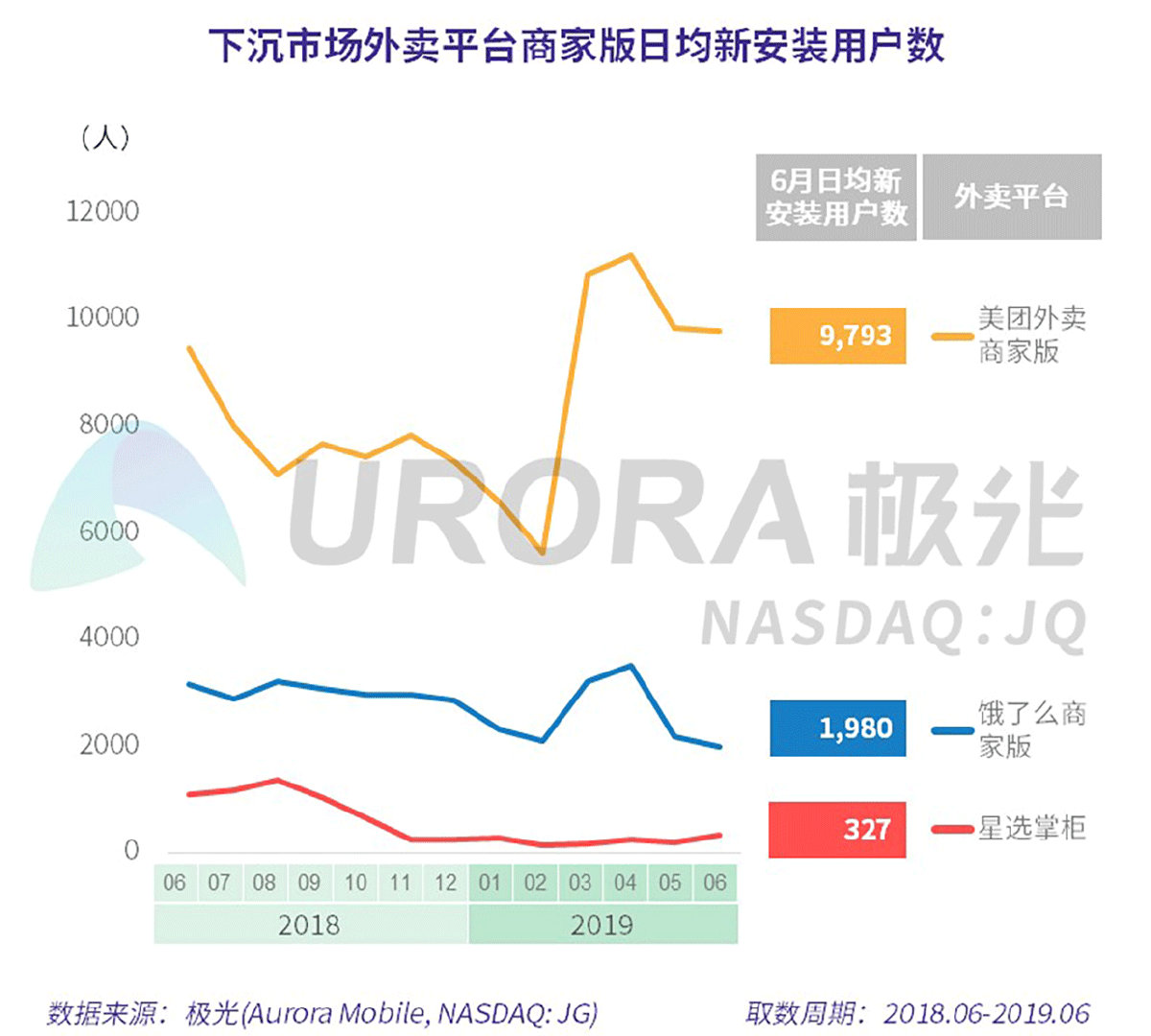 极光的统计结果显示,春节过后,美团外卖商家版日均新安装用户数增长明显,6月份日均新安装接近1万人,表明美团外卖对商家吸引力较强;饿了么6月日均新安装用户数接近2千,而星选掌柜新增较低。