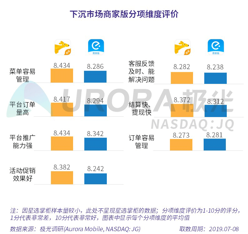 极光的统计结果显示,美团外卖整体服务能力获商家认可,饿了么订单管理方面较好。商家认为美团外卖在平台推广能力、菜单管理、订单量、活动促销、结算提现等方面表现较好,而饿了么在订单容易管理方面表现较好。