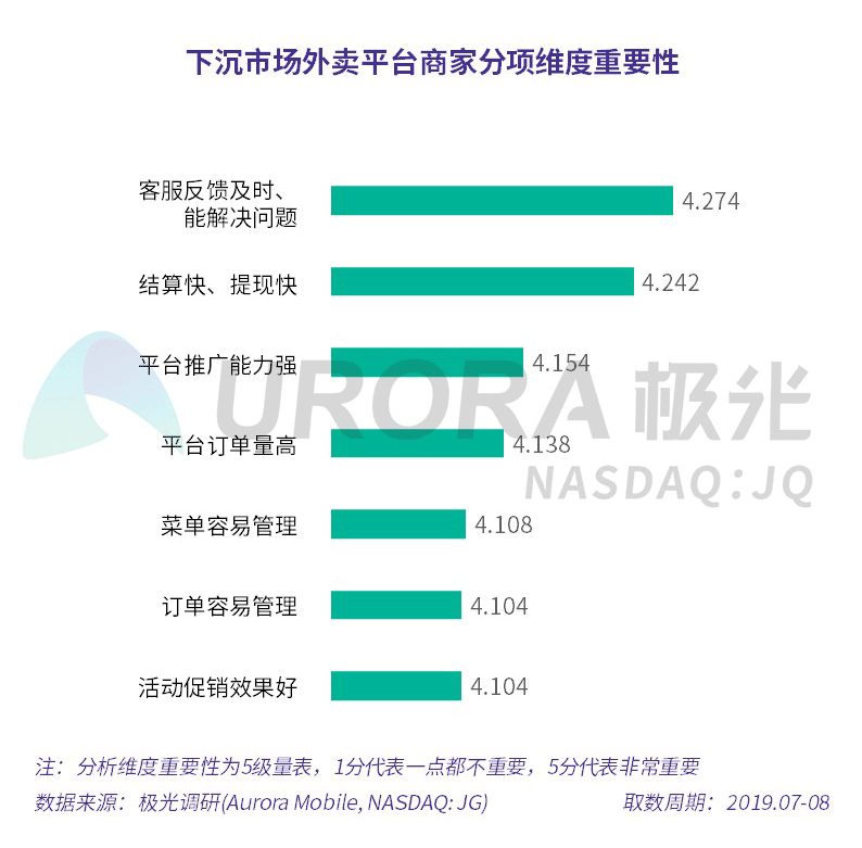 极光的统计结果显示,在外卖平台分项维度中,商家最看重客服反馈及时、能解决问题,其次是结算快、提现快,第三是平台推广能力强。