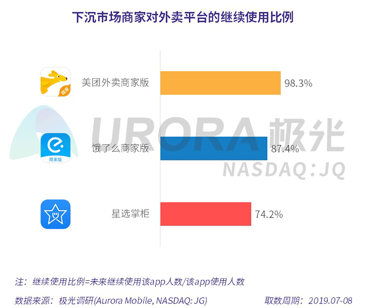 极光的统计结果显示,商家继续使用的比例普遍较高,98.3%的美团外卖商家用户表示会继续使用美团外卖平台,高于饿了么87.4%的数据占比。