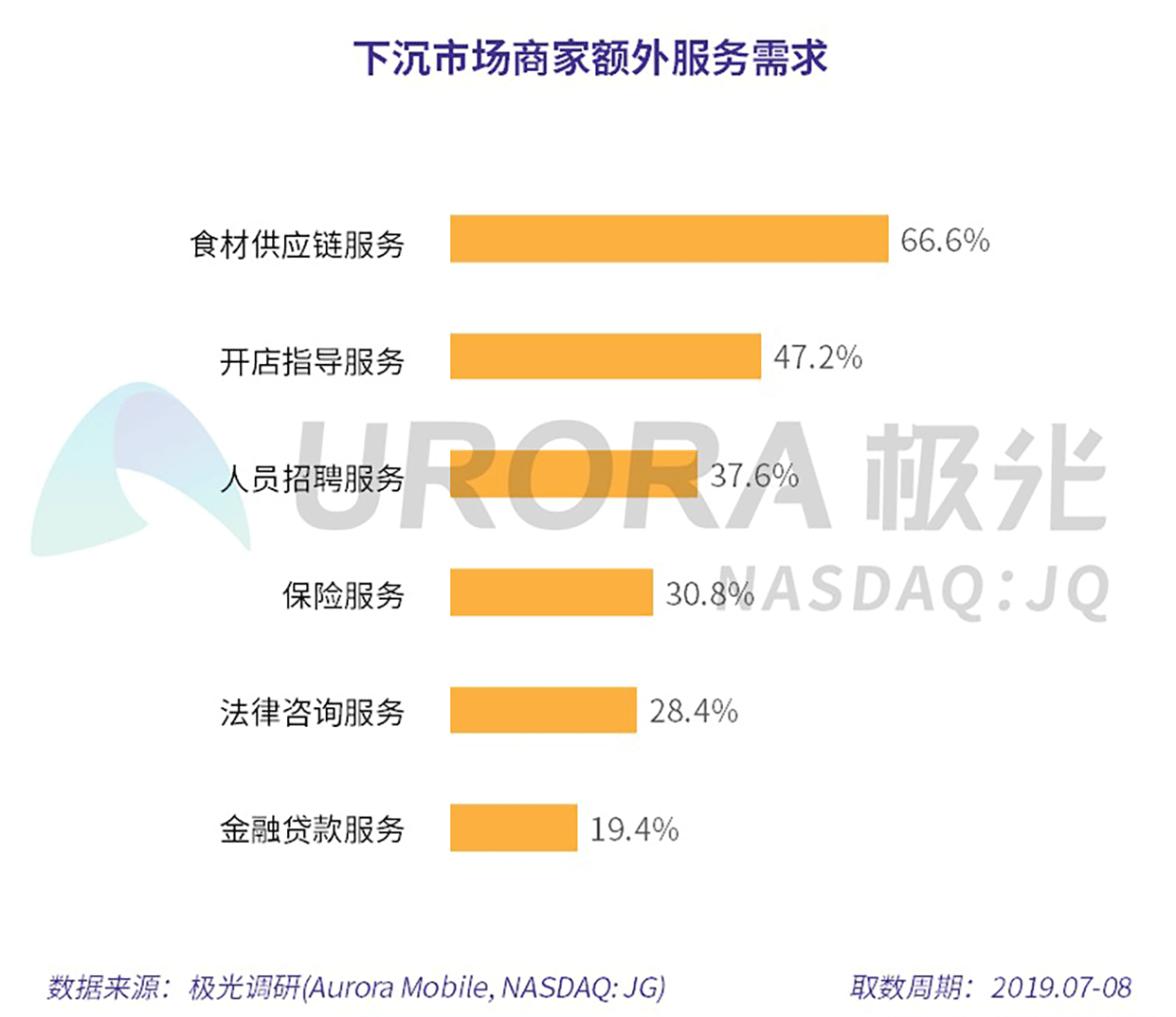 极光的统计结果显示,下沉市场商家希望外卖平台提供额外服务,其中,食材供应链服务占比最高,达66.6%,其次是开店指导服务,占比47.2%,而对金融贷款服务的需求最低。