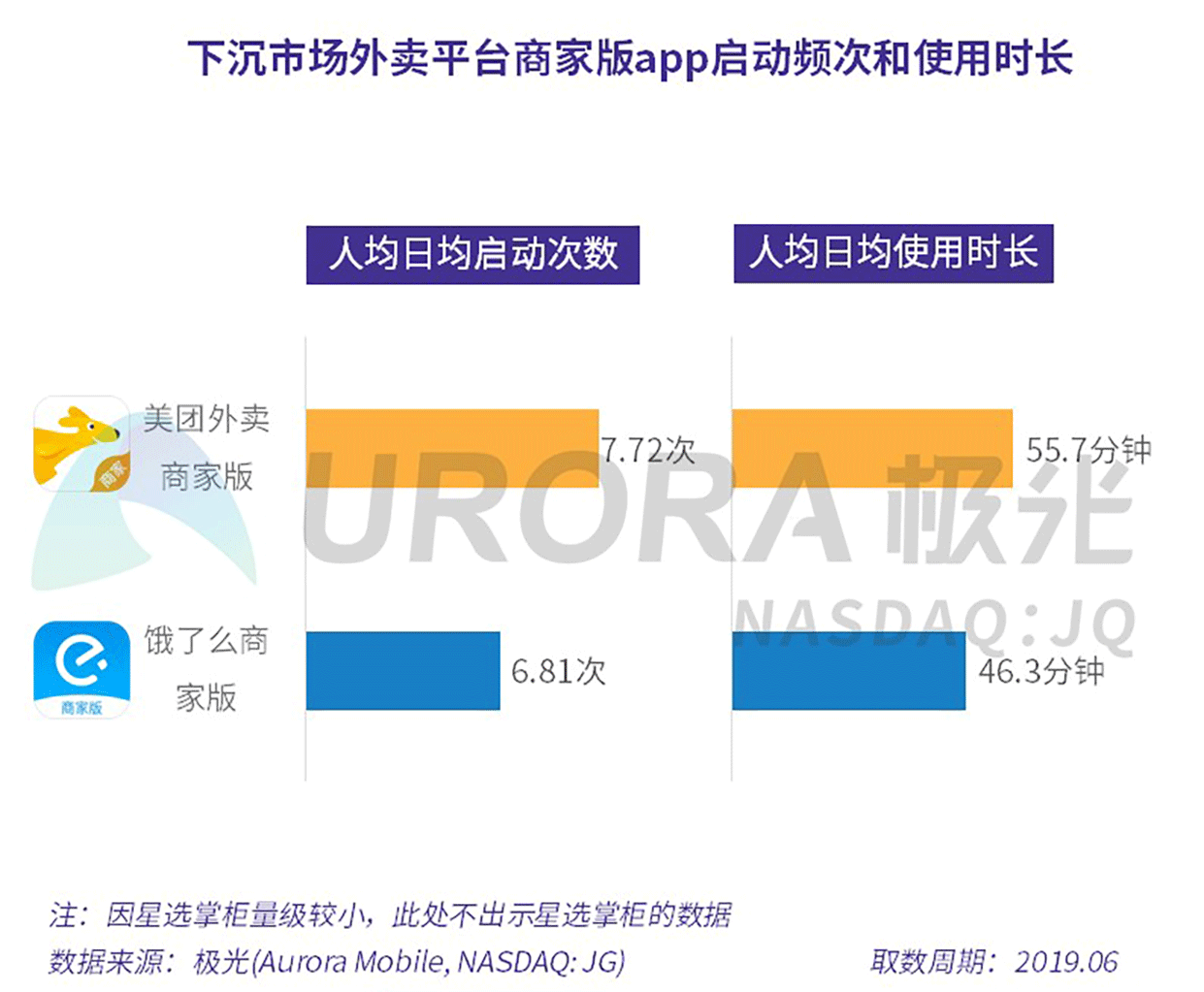极光的统计结果显示,美团外卖商家版在下沉市场的人均日均启动次数为7.72次,人均日均使用时长55.7分钟,饿了么商家版在下沉市场的人均日均启动次数6.81次,人均日均使用时长46.3分钟。