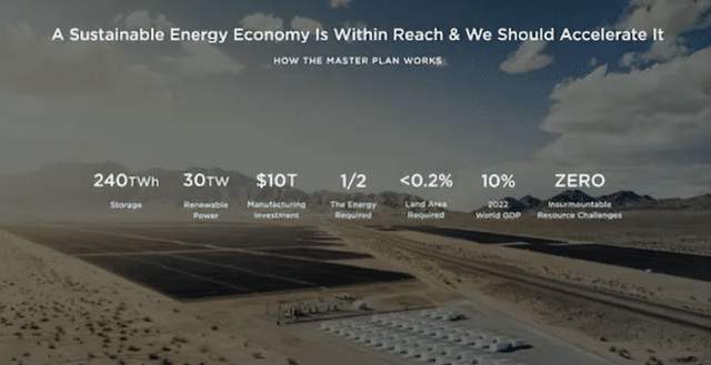 马斯克说:“今天不仅是特斯拉投资者,而且对于投资地球的任何人来说都是重要日子。地球将变成可持续发展能源,并且在你的有生之年会一直如此。” “事实上,你可以支持一个比地球大的多的文明,比地球上实际可持续支持的80亿人类要多得多。”