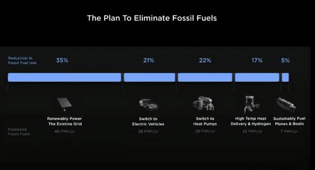马斯克尝试为地球使用可持续能源勾勒出了一条可行性路径,包括五大步骤:用可再生能源重新为现有电网供电;转向电动汽车;在家庭、企业和工业中转向用热泵;高温热输送和氢气燃料开发;为飞机和船只提供可持续能源。