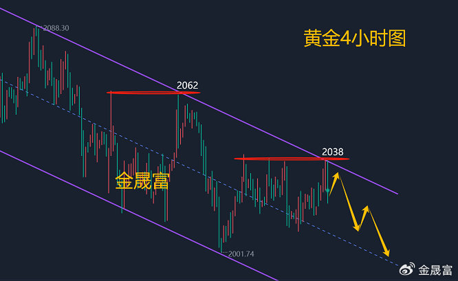 短线而言,4小时图呈震荡排列,晚间做冲高2038回落预期;实际美盘前在通道阻力2038承压快速回落,现报价2025;23点收线后4小时图呈空头排列,夜盘及明天做延续下跌预期;后面较为理想的介入位可以留意短期空头弱势分界线2040-43一线,日内级别未突破并站上2032一线之前任何反抽均是做空机会,保持顺势参与主基调不变,下部可以继续关注2010-15低位附近的目标,破位跟进2000大关。综合来看,今日黄金短线操作思路上金晟富建议反弹做空为主,回调做多为辅,上方短期重点关注2032-2035一线阻力,下方短期重点关注2010-2008一线支撑,各位朋友一定要跟上节奏。要控制好仓位及止损问题、严格设止损,切勿抗单操作。近期市场动荡幅度较大,机会与风险并存,控制风险再博收益。