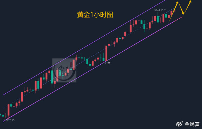 黄金1小时均线还是金叉向上的多头排列,多头力度还是比较强势,不过现在黄金价格离均线偏离太远,现在乖离率太大,所以要注意接下来的调整。那么调整要么是空间换时间,要么是时间换空间,不论哪一种方式都是需要等待,如果黄金用空间来完成快速调整,那么就要关注下方3185一线的支撑,然后黄金宽幅震荡来完成调整。那么另一种时间换空间,那么黄金可能就在3200上方维持窄幅震荡,然后再寻求突破,那么这一种黄金就还是属于强势形态,调整结束就又会有快速的拉升。鉴于当前消息面利好金价,下周稳健操作思路是等待回调后做多,上方不轻易猜测顶部。具体可在金价回调至3200-10时进场看涨,目标看向3270和3300。做空则建议在冲高无力后再考虑。综合来看,下周一黄金短线操作思路上金晟富建议回调做多为主,反弹做空为辅,上方短期重点关注3270-3280一线阻力,下方短期重点关注3210-3200一线支撑,各位朋友一定要跟上节奏。要控制好仓位及止损问题、严格设止损,切勿抗单操作。具体点位以盘中实时为主,欢迎前来体验,交流实时行情,进群关注实时单。