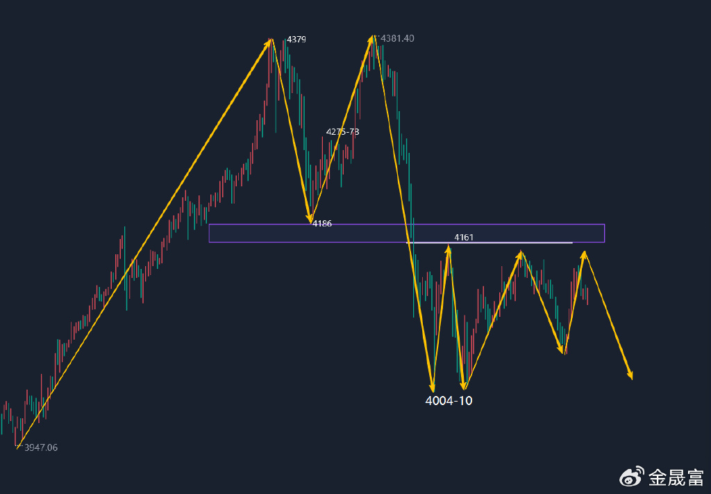 不过从黄金日线图来看,由于周五强势走高,日线收盘带了70美元长下影线,表明下方有一定买盘,下周初多头有望继续展开反扑,然而拉升后则偏向于继续走冲高暴跌态势。小时图来看,上方4161仍是关键位置,一旦站稳4161之上,那么小时图就是三重底形态,反弹进而继续上看4200附近。黄金1小时双顶之后,目前还是在1小时双顶的颈线位压制之下来回震荡,周五虽然CPI利多,不过并未让黄金多头突破4160,那么说明多头短期依然承压,还是继续大区间震荡,如果下周初不能突破4160,那么还是可以继续先高空,下方还是继续关注4000一带区域的支撑。如果黄金下周末有避险消息刺激或者直接突破4160,那么黄金多头可能开始反击,到时候顺势继续多。从另一个角度来说,大幅拉升一则扫干净市场空单,也将让市场对多头重拾信心,这也进一步形成诱多态势,接下来才能更好暴跌。综合来看,下周一黄金短线操作思路上金晟富建议反弹做空为主,回调做多为辅,上方短期重点关注4160-4185一线阻力,下方短期重点关注4010-4005一线支撑,各位朋友一定要跟上节奏。要控制好仓位及止损问题、严格设止损,切勿抗单操作。具体点位以盘中实时为主,欢迎前来体验,交流实时行情,进群关注实时单。