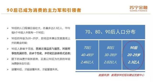 近日,苏宁金融研究院发布了《90后人群消费趋势研究报告》,报告从90后成长经历与消费观的养成、消费画像、消费趋势,以及消费隐忧等四个方面,对90后这个群体进行了全方位的剖析。《报告》显示,我国90后多达2.3亿人,他们出生于中国经济高速增长时期,充分享受到了经济增长的红利,物质生活相对富足,具备消费升级的主观需求;同时,受计划生育政策影响,90后一代多为独生子女,衣食无忧,潜移默化中塑造了注重品质与服务的消费理念;此外,90后是互联网的"原住民",注重个性、乐于尝试新事物、品牌意识也更强。可见,90后具备个性化、多样化、体验式的消费特征。