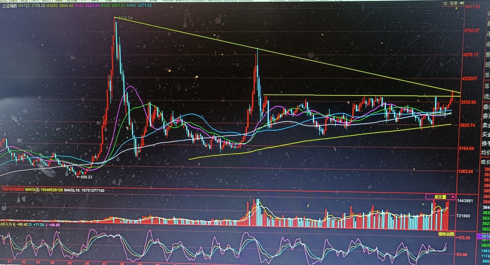 从月线图历史走势看,沪指2007年10月见顶6124点以来,形成长达18年的收敛大三角形形态,三角形上边为2007年10曰16日6124点和2015年6月12日5178点两大顶部连线,下边为250月移动平均线,这250月移动平均线是近12年以来最重要底部的支撑线,其附近分别形成了2013年6月1849点、2018年10月2449点、2024年6月2635点、2024年9月2689点这些底部,其中2024年6月2635点、2024年9月2689点刚好跌至其上形成强支撑。