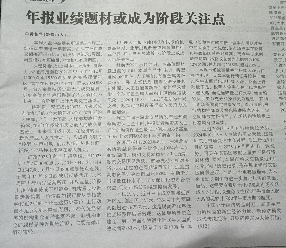 1月进入年报业绩预报和快报的披露高峰期,业绩出现改善或超预期的行业个股可望在大盘升势放缓下,阶段上或成为市场关注点。