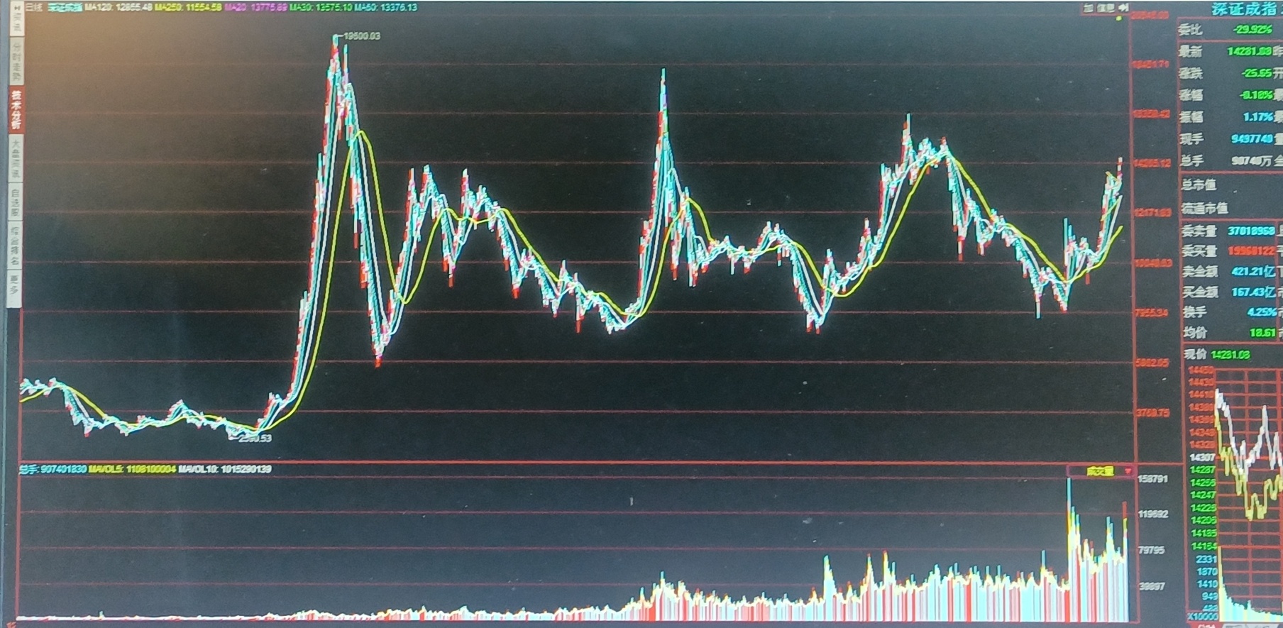 从走势看,按上周本栏指出,阶段上,深证成指面临2021年5月至同年12月14000点至15300点历史密集整理套牢区或存在反复消化压力,而从2024年9月下旬以来维持历史最大的成交量看,历史高位套牢筹码得到了不少消化,为未来上一台阶展开上升周期奠定基础。