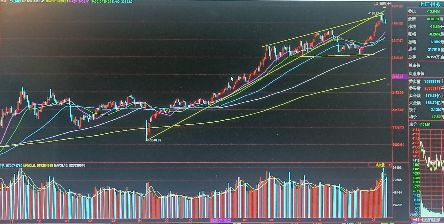 经过2024年9月下旬持续拉升后,2024年10月8日大盘放出历史天量,这是见底后市场快速建仓过程,后展开近9个月的调整,于2025年6月再走出一轮涨势,可见在底部区域放巨量并不是行情的终结,同样,本周市场成交额接近4万亿元,创出历史记录,是在脱离熊市底部区阶段出现,也是一个重要里程碑,为未来市场长期牛市进一步奠定扎实的基础,当然,这需要有蓄势消化和提高市场长期成本的过程,以避免以往仅2年牛市而大起大落的现象,打破2年牛市周期的魔咒。