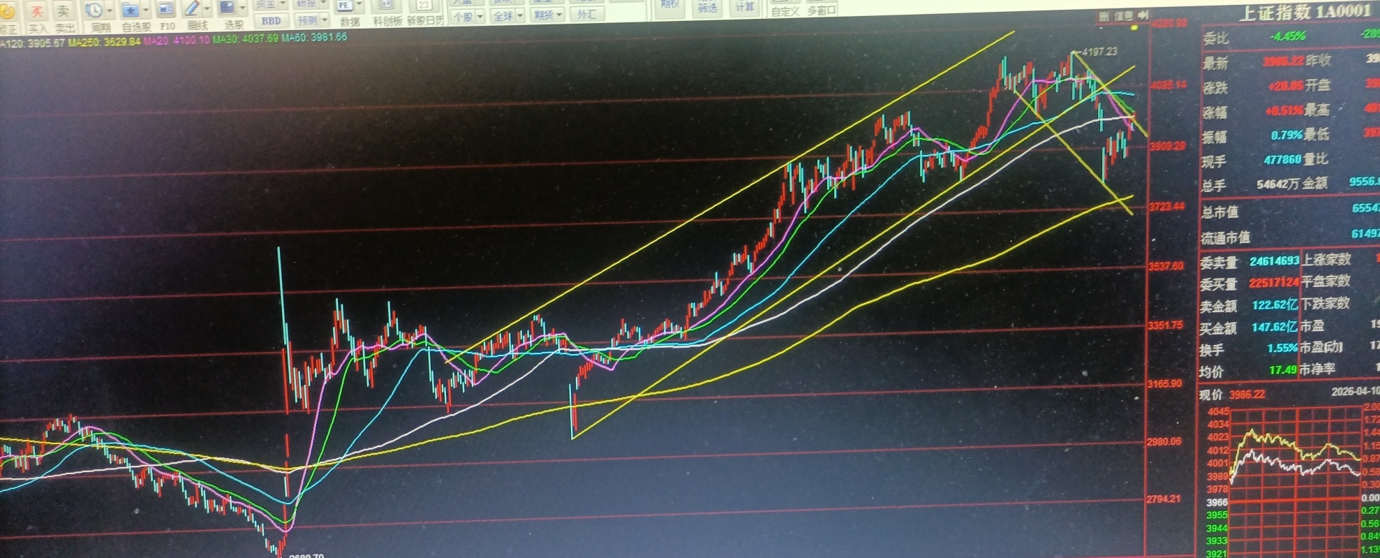 从市场走势看,沪指本周回补了3月23日下跌缺口,周五到达上周本栏分析的今年1月中旬以来形成的下降通道走势上轨,即3月3日4197点、3月12日4141点两高点连线,目前与30日均线、半年线相交汇于4000点上下,周五盘中有所受阻。这些地带是市场阶段强弱的分水岭,未来需要向上突破才能进一步走稳转强,这仍要看金融股特别是券商股能否进一步回升,以推动沪指突破。