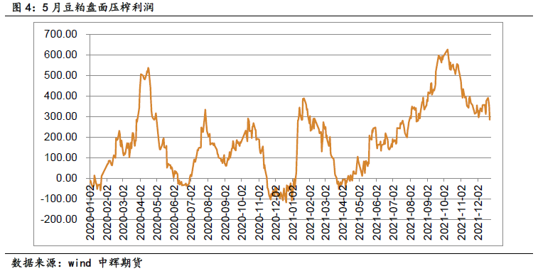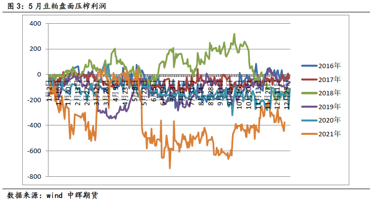 从历史盘面压榨利润数据来看,2021年 5月豆粕进口盘面压榨利润,大幅低于往年同期水平,外强内弱的价格矛盾,导致高进口成本支持国内豆粕价格维持偏强。 截止12月23日,盘面利润-374元/吨,前日盘面利润为445元/吨。