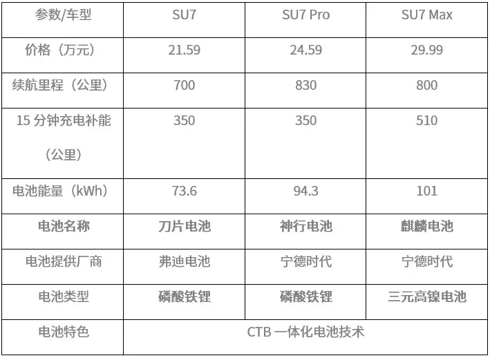 本次小米汽车发布了三款车型,均为C级车,集我国动力电池行业之大成,既有比亚迪的最先进刀片电池,又有宁德时代最先进的神行电池和麒麟电池。可以说,基本搭载了动力型锂电池中的最新最先进技术。从小米汽车,可以一睹我们目前商用电池技术领域最先进技术。我们从下面的表来找到他们用的是哪些“高端技术电池”。