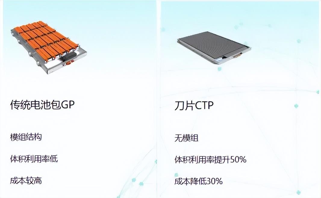 从弗迪电池(比亚迪子公司)官网可以看到传统电池包GP结构和CTP结构的差别。