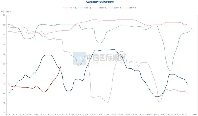 4月份以来,随着下游消费旺季的来临,市场拿货积极性有所回升,虽然需求仍不及往年同期水平,但是较3月份还是有明显好转迹象。据百年建筑调研,截至4月中旬,样本建筑工地资金到位率为61.77%,周环比增加0.91个百分点。其中非房建项目资金到位率为64.5%,周环比增加0.96个百分点,房建项目资金到位率为45.69%,周环比增加0.67个百分点,资金到位环比改善较为明显。而从钢材生产情况来看,随着炉料价格的下行,钢厂利润有所改善,铁水产量小幅提升,钢联公布的最新一期数据显示,247家钢铁企业盈利率48.48%,比上月增加27.27个百分点,日均铁水产量为226.22万吨,月度环比增加5.4万吨,增幅2.44%,随着钢厂盈利水平的提升和下游开工的增加,钢材需求仍有望保持小幅回升的态势。