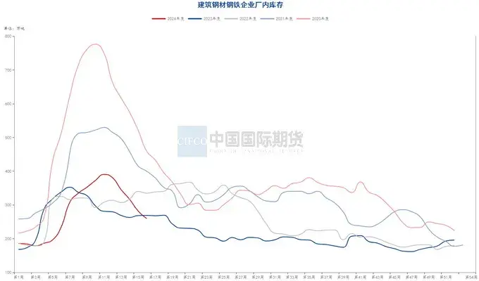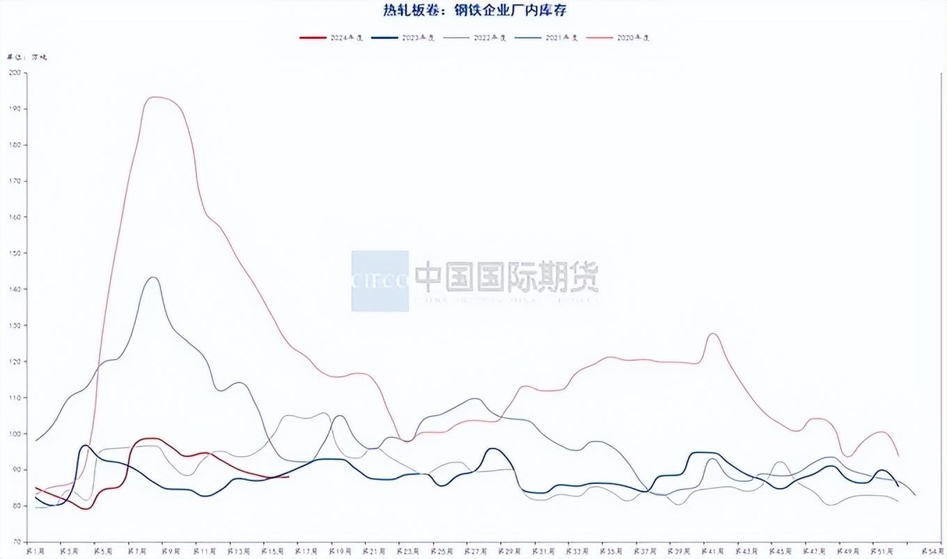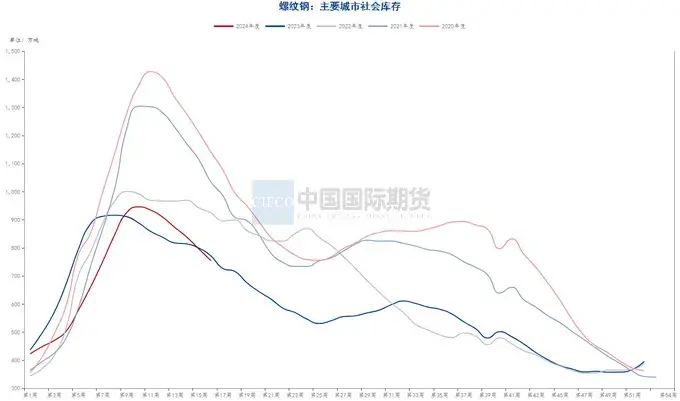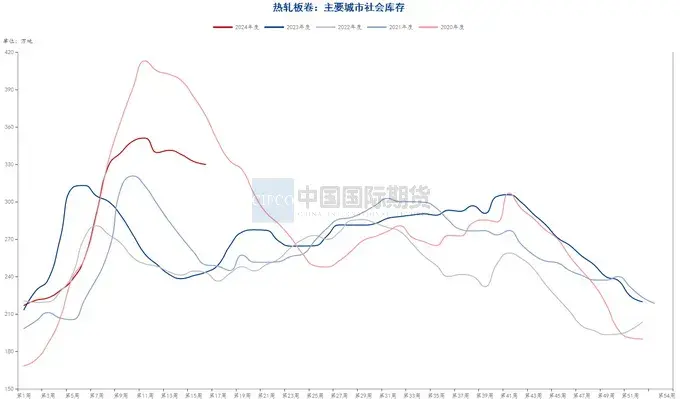 最新一期钢联库存数据显示,五大品种库存总量为2034.04万吨,周环比降99.14万吨,降幅4.6%。其中建材库存周环比降90.26万吨,降幅7%;板材库存周环比降8.88万吨,降幅1.1%。上期库存总量为2133.18万吨,周环比降108.02万吨,降幅4.8%。其中建材库存周环比降100.47万吨,降幅7.77%;板材库存周环比降7.54万吨,降幅0.9%。从目前库存情况看,成材去库情况连续几周均有所转好,钢材库存压力正逐渐减弱。从库存结构看,目前螺纹钢库存已降至历史同期的低位,相较于热卷而言,库存也更加健康。