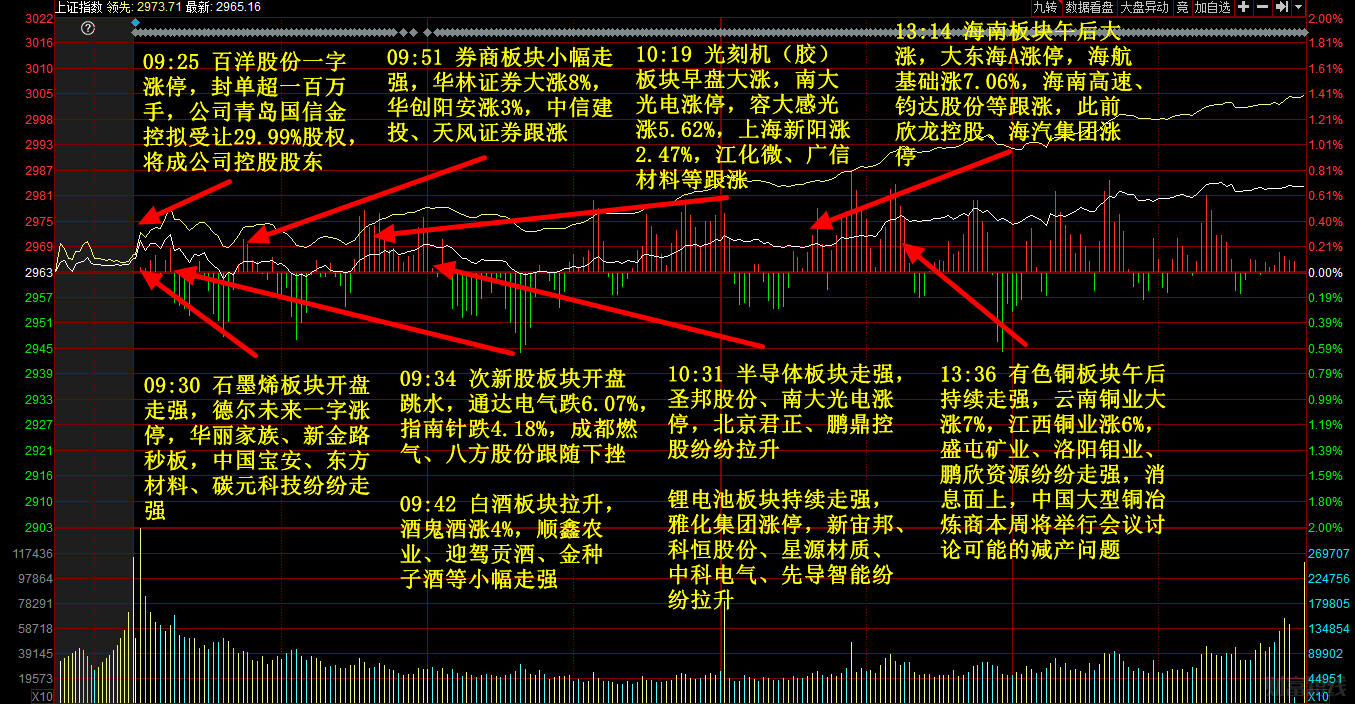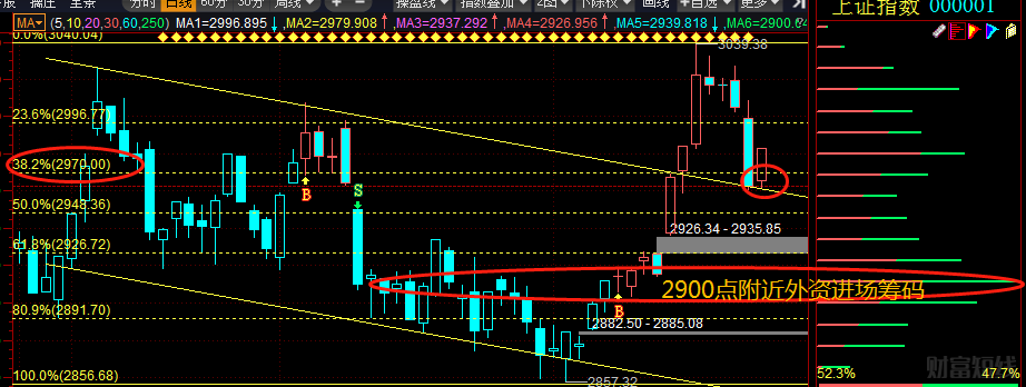 总结:2960附近依旧是强弱的分界点。2960点的下方可以大胆建仓和低吸。因为外资在2900点不断的吸筹,内资需要这两天趁着外资休息,回落抢筹,因为外资的成本比内资的成本要低。所以把握好3000点下方的低吸机会和建仓机会。回落就是低吸抢筹机会