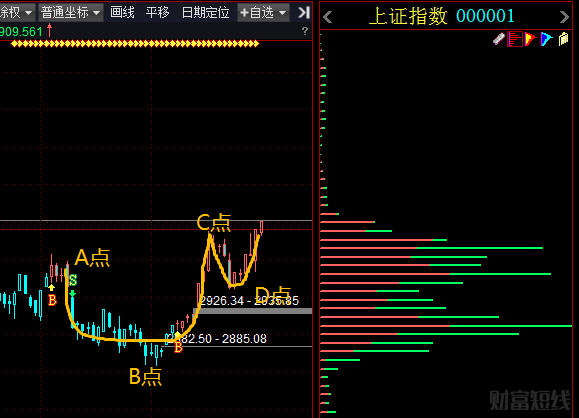 形态上:杯底+杯柄形态完成,突破且站稳C点(3040点),有望开始主升浪行情。