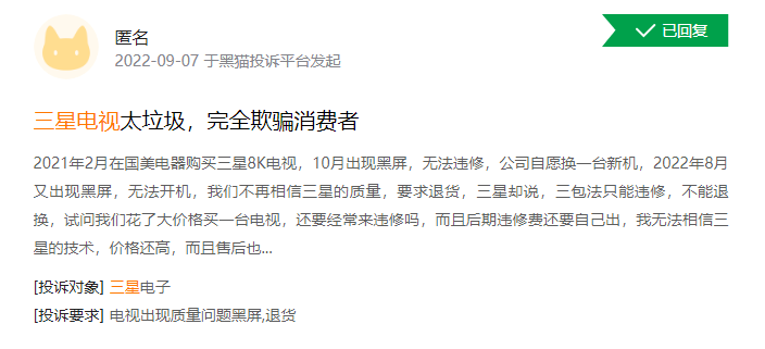 与此同时,产品出现质量问题,三星并没有给出消费者满意的服务。三星电视不仅产品售卖价格高,同时售后服务的价格也同样高。一些因电视本身的电容烧毁的质量问题,在外面街边店铺只需数十元就能解决,但三星售后的这一故障维修花费高达600元。