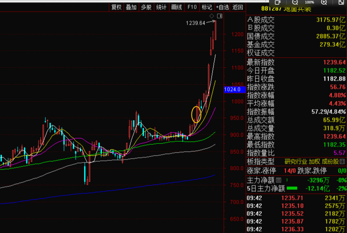 军工目前和AI两强,当下每天1.5万亿左右的成交金额足够支持三条主线一起涨。所以两强属于正常。龙头继续拉。下图军工细分行业指数黄圈处让大家首次关注,至今涨了30%+。今天继续向上加速。目前属于二级行业中涨幅第一。