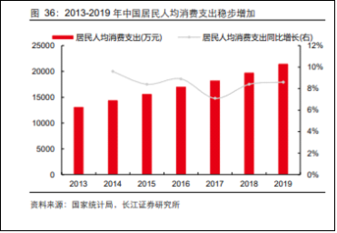 2019年,中国居民人居消费支出 2.2 万元,同比增长 8.6%,这种居民人均消费支出的增加,持续刺激着服装内需市场的扩容。从2014到2018年,中国服装类零售额增速始终保持在 6%到8%左右。