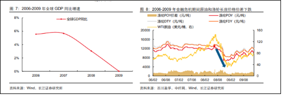 发生在2008年的第一次波动,源于世界金融危机导致经济增速下行,市场需求不振,原油价格下跌,涤纶长丝价格快速下跌,行业盈利能力整体下滑。