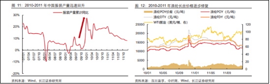 从2010年开始,随着各国经济刺激政策落地,下游需求逐渐回升,在2010、2011年,中国服装产量快速增长,推动涤纶长丝价格回升,其中POY纤维涨价尤为突出,从10000万每吨的价格,一度冲到15000元每吨的高峰。