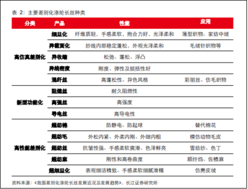 纺织服装作为涤纶长丝的终端应用领域,通常会决定涤纶长丝的性能要求。由于差别化纤维可以克服一般的聚酯纤维如吸湿性差、易积聚静电、易吸尘沾污、不易染色等部分缺点,在消费升级的前提下,差别化涤纶长丝正在替代传统长丝满足市场需求。