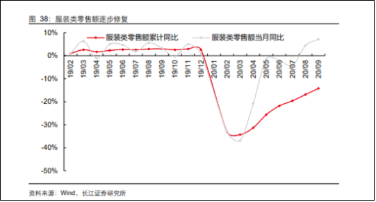 通过wind 的数据可以看出,遵循着“金九银十”的传统旺季预期,2020年8、9两月,服行业步入提前备货阶段,服装类零售额当月分别同比增长4.4%和7.2%。