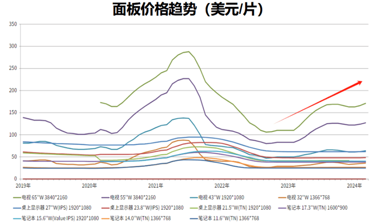 从2022年10月起,主流面板价格逐步企稳,到了2023年3月起,一度开启七连涨的景气区间,进入2024年,再次进入缓慢上升通道。