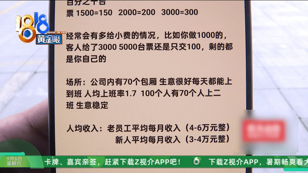 9月7日,《1818黄金眼》栏目报道,为筹措20万的血管瘤手术费,山东的蔡女士一直急于寻找高薪工作筹措医疗费。8 月底,社交平台上某网友提供给蔡女士一个“高薪”工作机会:“新人平均月薪 3万-4 万元,老员工能拿 4万-6 万元,还包吃包住,客人常给小费”。蔡女士遂来到杭州面试。