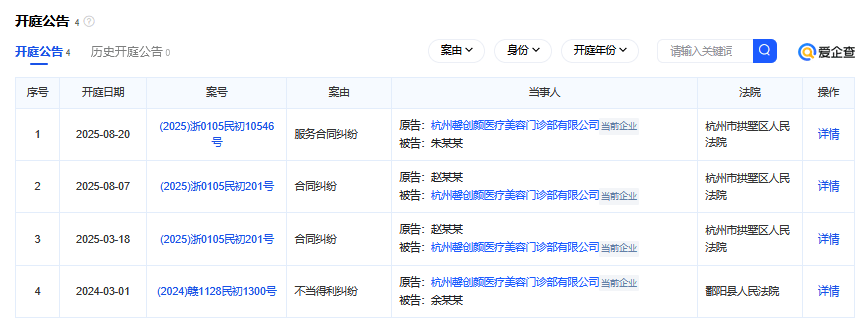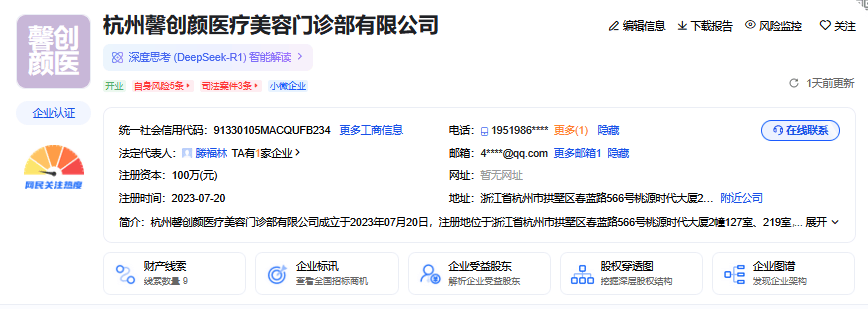 爱企查数据显示,杭州馨创颜医疗美容公司成立于2023年,注册资本100万元。注册资本100万元人民币,法定代表人滕福林,股东为杭州创颜医疗管理有限公司(60%)、杭州馨颜医疗管理有限公司(23%)、杭州瑞颜医疗管理有限公司(17%)。天眼查数据显示,馨创颜最终受益人为汪艳,最终受益股份23%。
